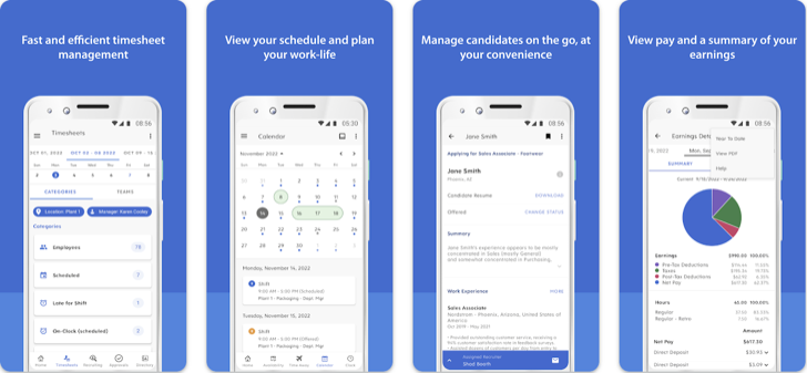 Dayforce provides a host of features that help employees manage their work tasks efficiently. Employees can view their schedules, submit time off requests, and set performance goals with this app from their mobile device. Besides, employees have an option to receive instant pay request and access crucial work-related data and documents.