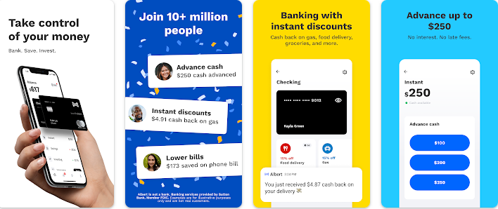 - Cash advances: Albert can advance you up to $250 from your next paycheck, with no interest or fees.