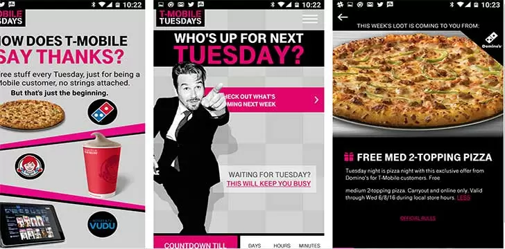 Offers vary weekly but have included free pizzas from Domino's, free movie rentals from FandangoNOW, and discounts on gas from Shell. The T-Mobile Tuesdays program is just one way the company shows appreciation for its customers.