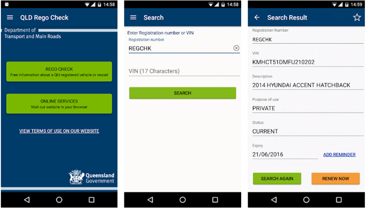 The app is powered by the Department of Transport and Main Roads in Queensland, and provides registration information for cars, trucks, trailers, vessels and motorcycles. You can easily access and verify the registration status of any vehicle by simply entering either the registration number or the Vehicle Identification Number (VIN).